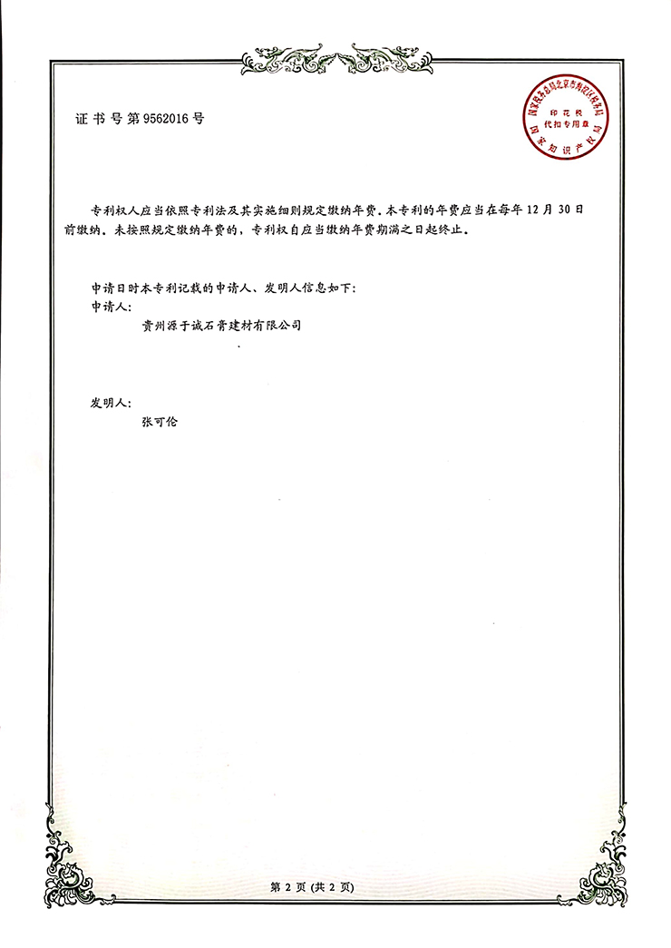 專(zhuān)利證書(shū)(一種石膏板側(cè)壁紙面粘結(jié)裝置)